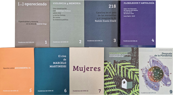 Hefte des ICPA-GZ CAMBIO CLIMÁTICO EN PARAGUAY Concurso de CómicsGanadores del ConcursoCuadernos del ICPA-GZ[11] | 02.2023 PORTUNHOLAS Laboratorio para mujeres artistas en las fronteras de América del SurEdición de Adriana AlmadaCuadernos del ICPA-GZ[10] | 08.2022 Despuésde la Pandemia ¿Qué nos espera luego de la pandemia?CONCURSO DE CUENTOS CORTOSCuadernos del ICPA-GZ[09] | 12.2020 COMICWERKSTATT INMIGRACION ALEMANAEN PARAGUAY///Cuadernos del ICPA-GZ[08] | 11.2020 Mujeres Cuadernos del ICPA-GZ[07] | 12.2019 El cine deMARCELO MARTINESSI Cuadernos del ICPA-GZ[06] | 12.2018 Apuntes sobredOCUMENTA 14 Cuadernos del ICPA-GZ[05] | 12.2017 FLORILEGIOS Y ANTOLOGIA Sobre Yo El Supremo de Augusto Roa Bastos y otras obras del mismo autorLucy Yegros – AretéCuadernos del ICPA-GZ[04] | 12.2017 218 Catalina en el paísde las maravillasy el imaginario deRamón Esono EbaléCuadernos del ICPA-GZ[03] | 07.2017 VIOLENCIA y MEMORIAUna conversacióncon Dominique Duboscsobre cine y ciertas formasde contar la violencia políticaCuadernos del ICPA-GZ[02] | 12.2016 […] apareciendo Espectralidad y memoriaen la obra de Gabriel OrgeCuadernos del ICPA-GZ[01] | 12.2016