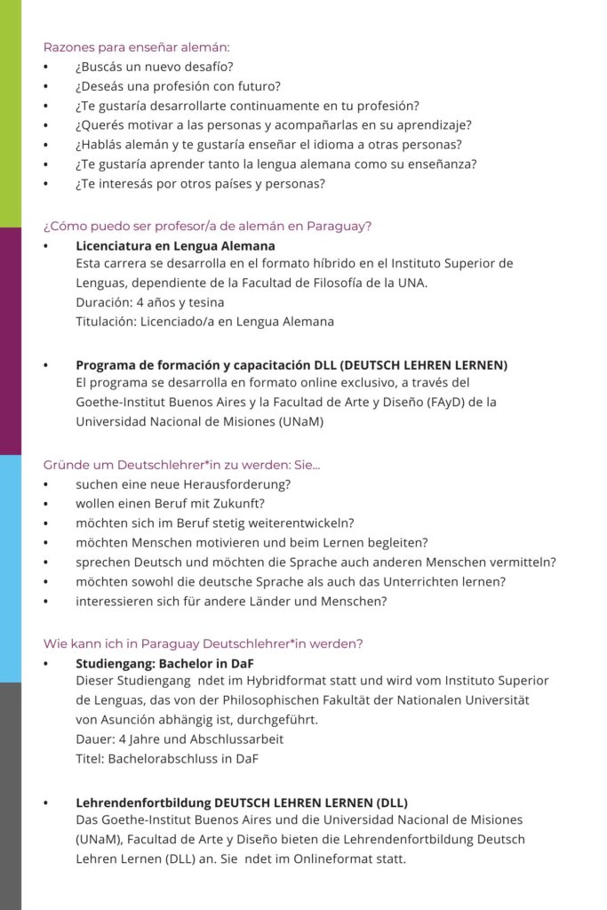 Dieser Studiengang findet im Hybridformat statt und wird vom Instituto Superior de Lenguas, das von der Philosophischen Fakultät der Nationale Universität von Asunción abhängig ist durchgeführt.