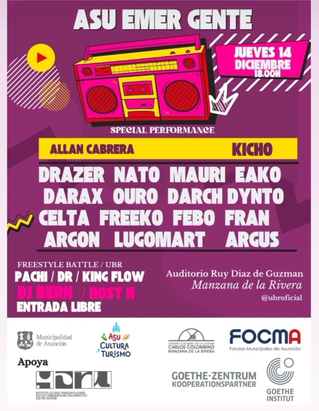 Asu Emer Gente es encuentro de cultura y arte urbano que de manera amplia busca reunir a diferentes expresiones artísticas, atendiendo los cruces estilísticos y estéticos que se producen. Serán muchos los nuevos artistas, que tendrán la posibilidad de mostrar su lo que producen, en las mismas condiciones que cualquier artista consagrado.