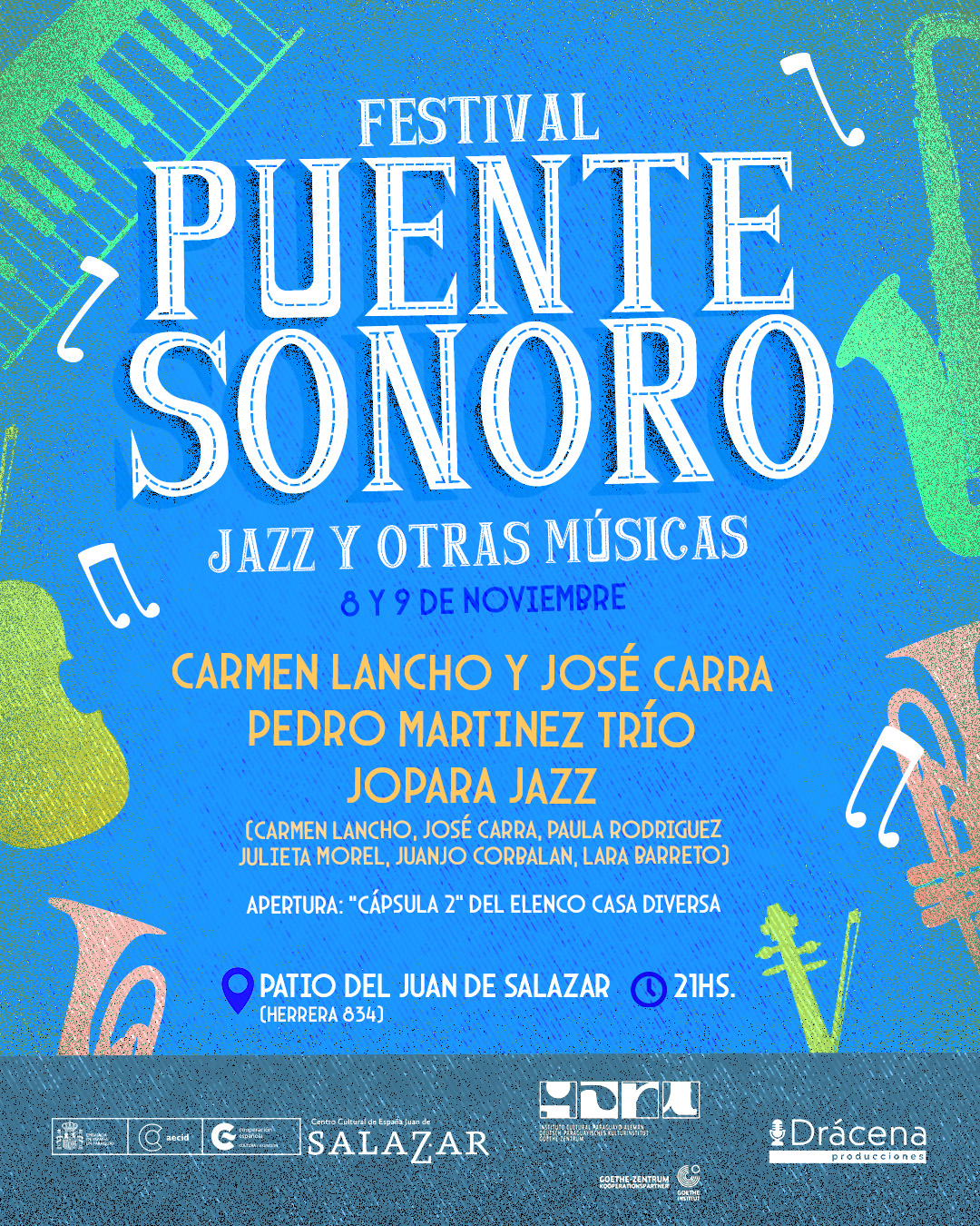 El Centro Cultural de España Juan de Salazar y el Instituto Cultural Paraguayo Alemán, en alianza con Sincopa Producciones y Drácena Producciones, presentan el Festival Puente Sonoro. Dos jornadas dedicadas al jazz a través de un programa de encuentros que integra conciertos, performances y talleres, con artistas de Paraguay y España.