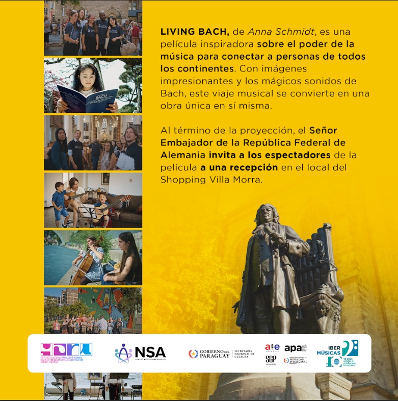 La Sociedad Bach del Paraguay y la Embajada de la República Federal de Alemania, con el apoyo del Instituto Cultural Paraguayo-Alemán, invitan a todo el público interesado a participar de la función de gala de la película Living Bach, de la directora Anna Schmidt. La cita es el día jueves 21 de marzo del corriente a las 19 horas en el Cine Villamorra (Avda. Mcal. López y Senador Long). Al término de la proyección, el Embajador de Alemania invitará a los espectadores de la película a compartir un brindis junto a la directora Anna Schmidt y varios protagonistas.