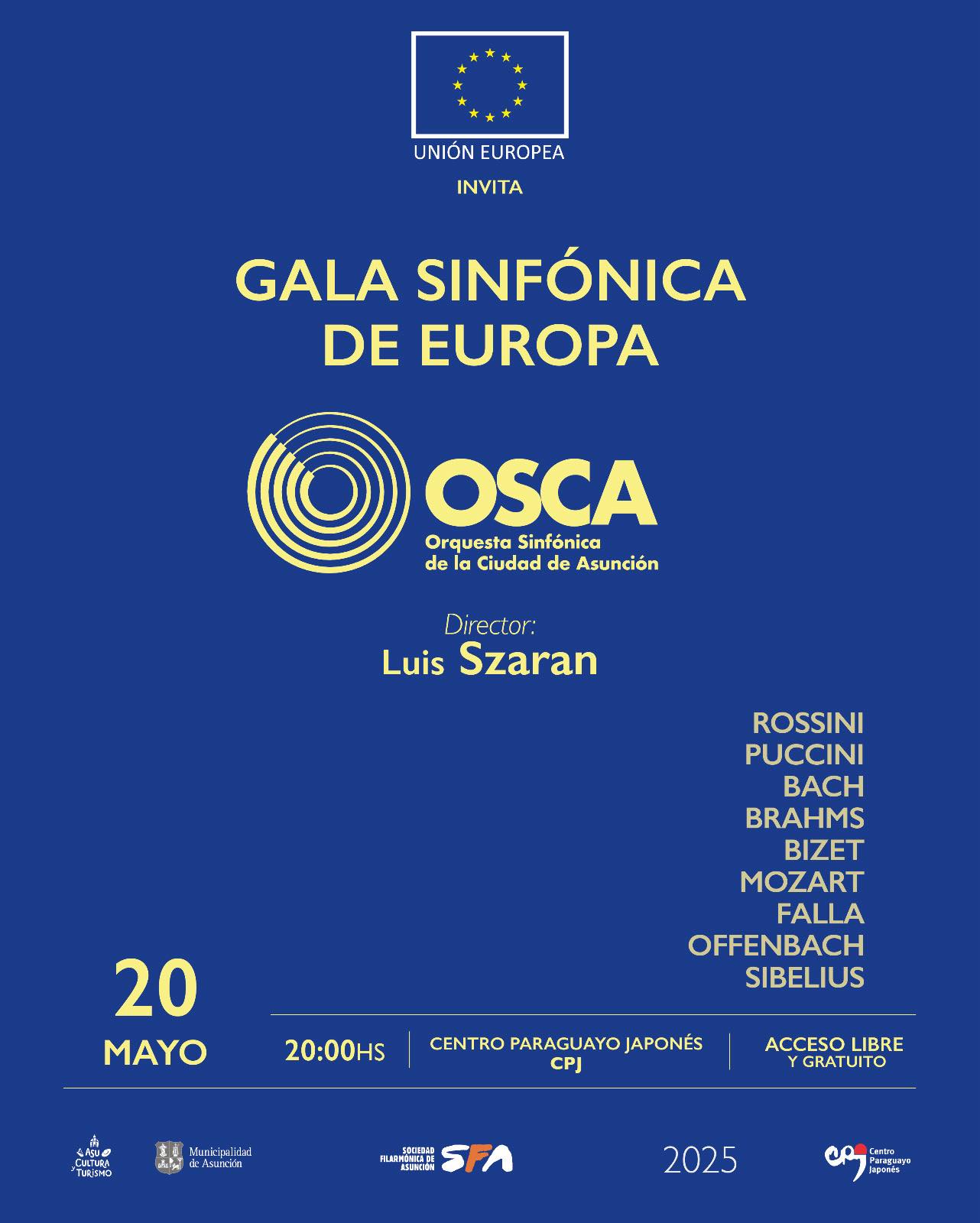 De la mano de la Orquesta Sinfónica de la Ciudad de Asunción (OSCA), dirigida por el maestro Luis Szarán, tendrá lugar un concierto emocionante. Sonarán las obras más clásicas de leyendas como Bach, Mozart, Rossini y Puccini. El evento se realiza en conmemoración del Mes de Europa y como apertura el XVI Ciclo de Cine Europeo, organizado por la Delegación de la Unión Europea en Paraguay.