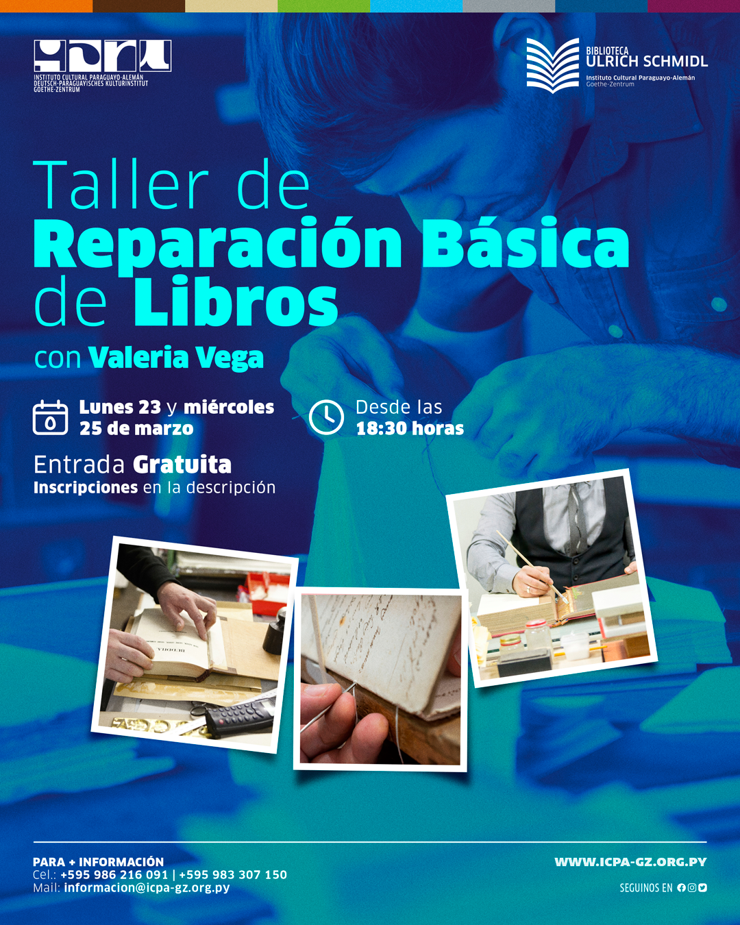 Vas a aprender a identificaciar daños, la aplicación de técnicas de reparación básica y el fortalecimiento de criterios profesionales para el cuidado del acervos y/o colecciones bibliográficas. Dirigido a bibliotecarios, auxiliares de biblioteca, gestores de información y profesionales vinculados al manejo de colecciones documentales. Las clases serán con Valeria Vega.