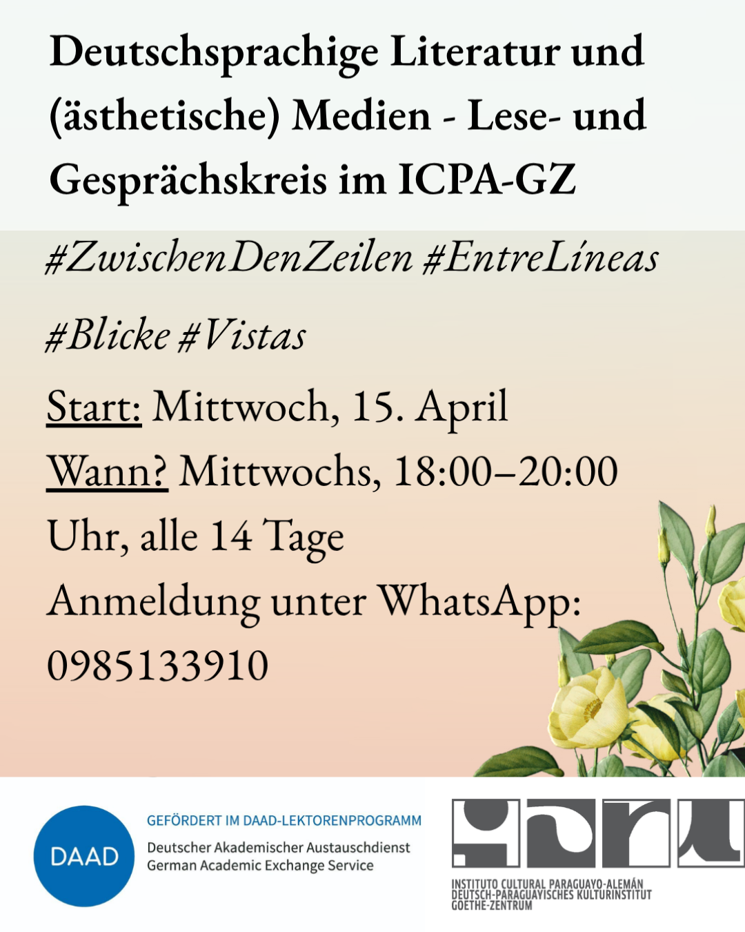 “Deutschsprachige Literatur und (ästhetische) Medien – Lese- und Gesprächskreis im ICPA-GZ” #ZwischenDenZeilen #EntreLíneas #Blicke #Vistas Es un espacio para conocer