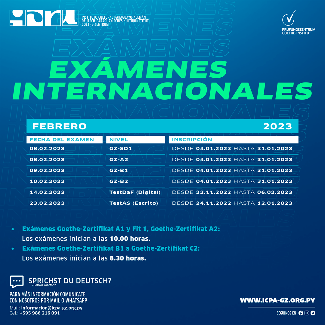Instituto Cultural Paraguayo-Alemán - Goethe-Zentrum | ICPA-GZ Juan de Salazar 310 c/ Artigas_, Asuncion, ParaguayPara más información +595 983 307 150 | WhatsApp +595 (021) 22 44 55 | Teléfono informacion@icpa-gz.org.py https://icpa-gz.org.py/examenes-internacionales/