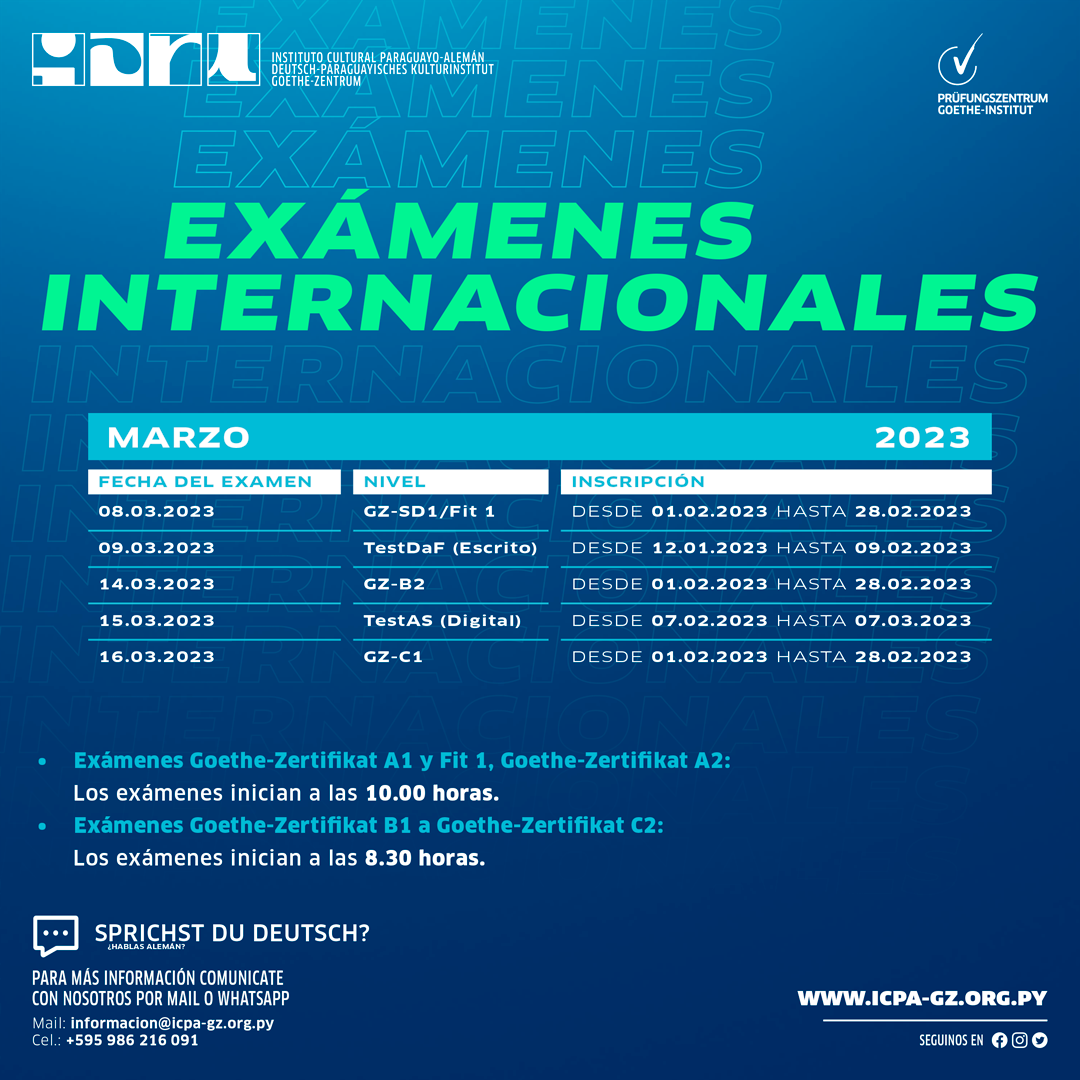 Instituto Cultural Paraguayo-Alemán - Goethe-Zentrum | ICPA-GZ Juan de Salazar 310 c/ Artigas_, Asuncion, ParaguayPara más información +595 983 307 150 | WhatsApp informacion@icpa-gz.org.py https://icpa-gz.org.py/examenes-internacionales/