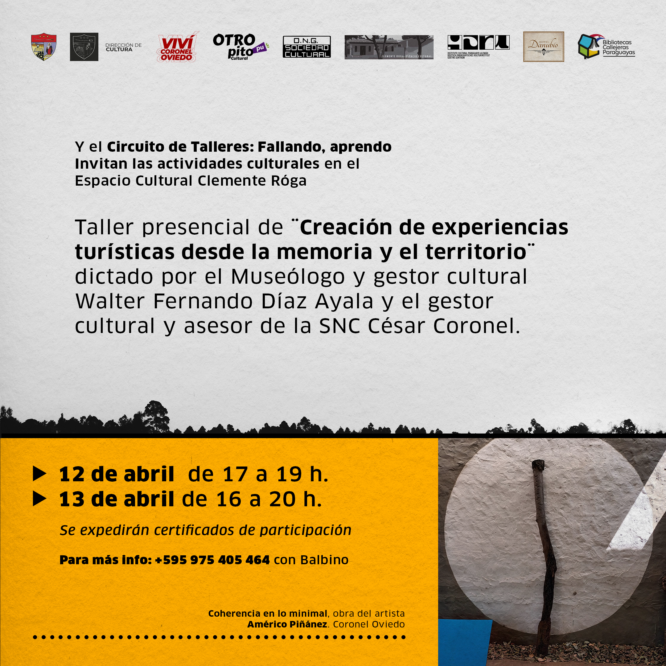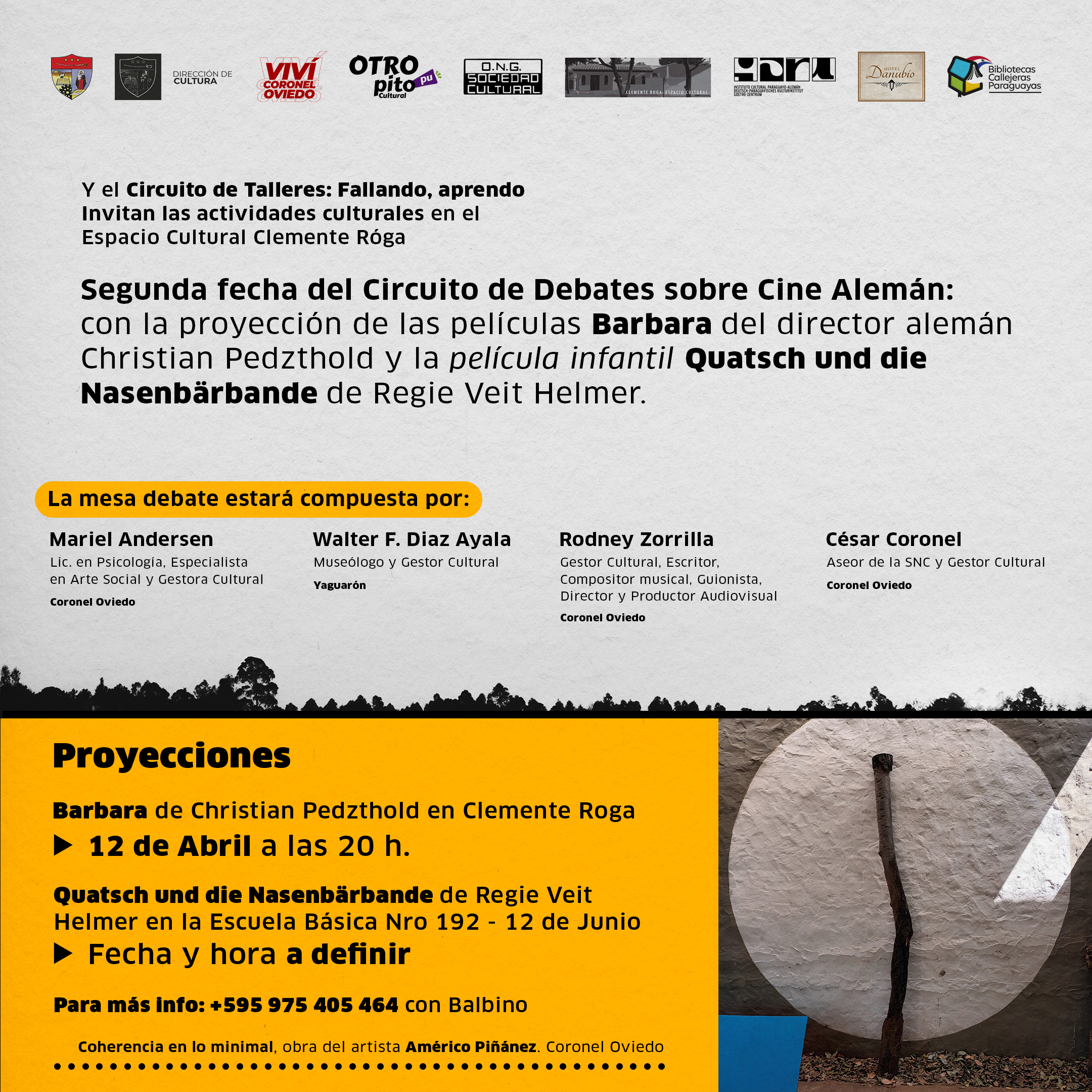Viernes 12 | 20:00 horas Entrada libre & gratuita Espacio Cultural Clemente Róga Juan Angel Benitez 609 Coronel Oviedo +