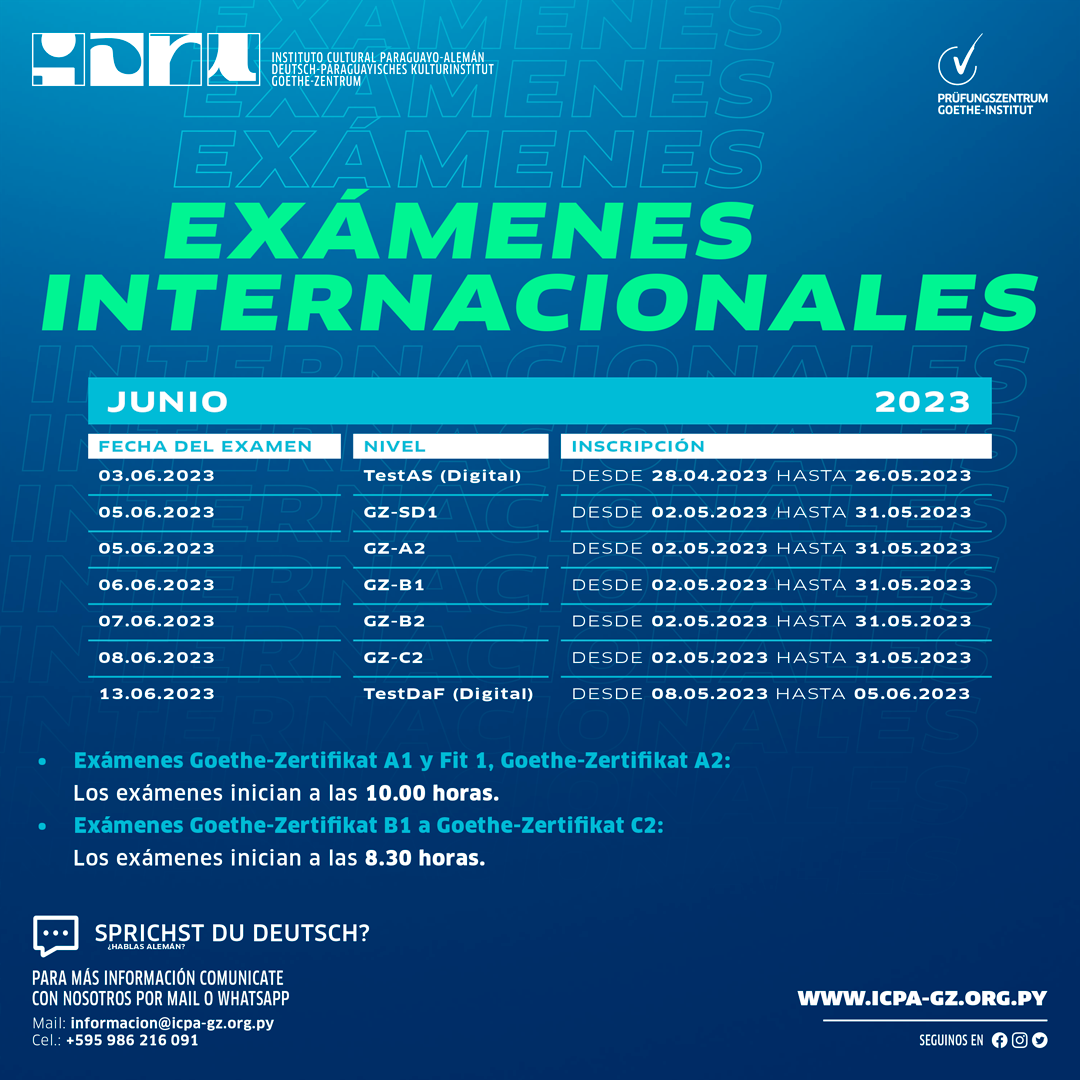 Para más información +595 983 307 150 | WhatsApp +595 (021) 22 44 55 | Teléfono informacion@icpa-gz.org.py https://icpa-gz.org.py/examenes-internacionales/ |